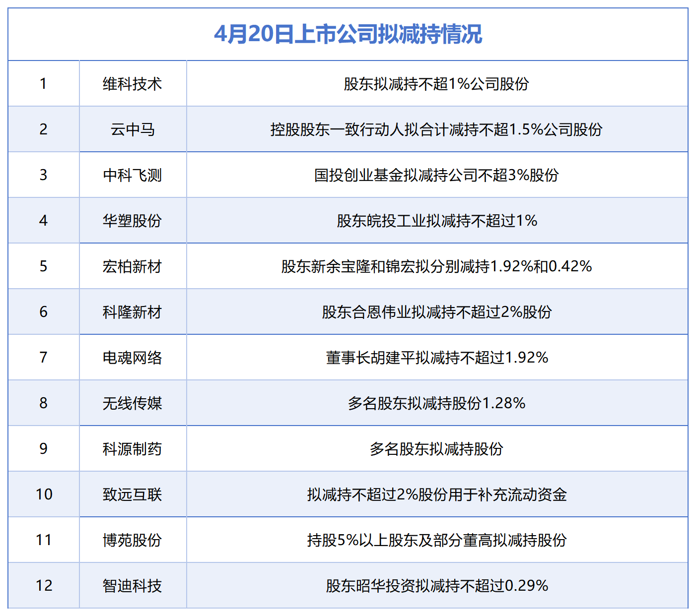 据统计,4月20日,盘后,中科飞测、云中马、维科技术、华塑股份、宏柏新材、科隆新材、电魂网络、无线传媒、科源制药、致远互联、博苑股份、智迪科技在内的12家A股上市公司披露拟减持情况,暂无A股公司披露增持情况。