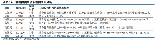 机构抱团是A股结构性行情中的典型资金现象。从历史经验看,每一次抱团的形成与板块投资逻辑的市场认可度息息相关,而抱团的瓦解往往意味着投资逻辑逐步被证伪。典型的机构抱团行为一般会经历四个阶段:认知形成、持续加仓(爬坡)、高位震荡(顶部)、抱团瓦解。