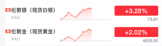 其中,黄金、白银直线拉升,黄金大涨超2%,白银涨超3%。