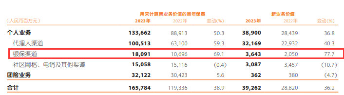 2023年全年,中国平安银保渠道新业务规模保费196.99亿,增长了79.26%,银保渠道的新业务价值36.43亿,增长了77.7%。