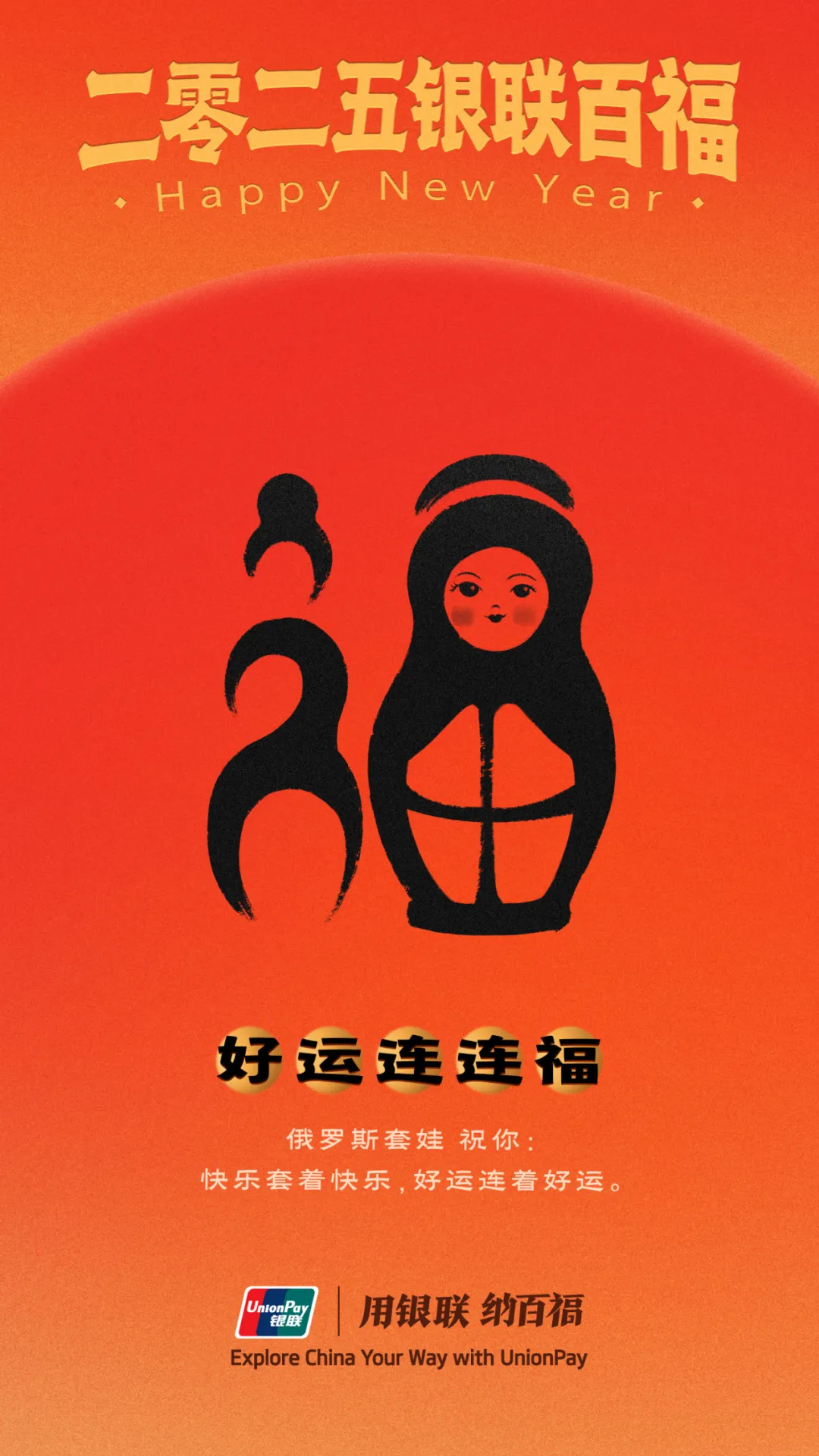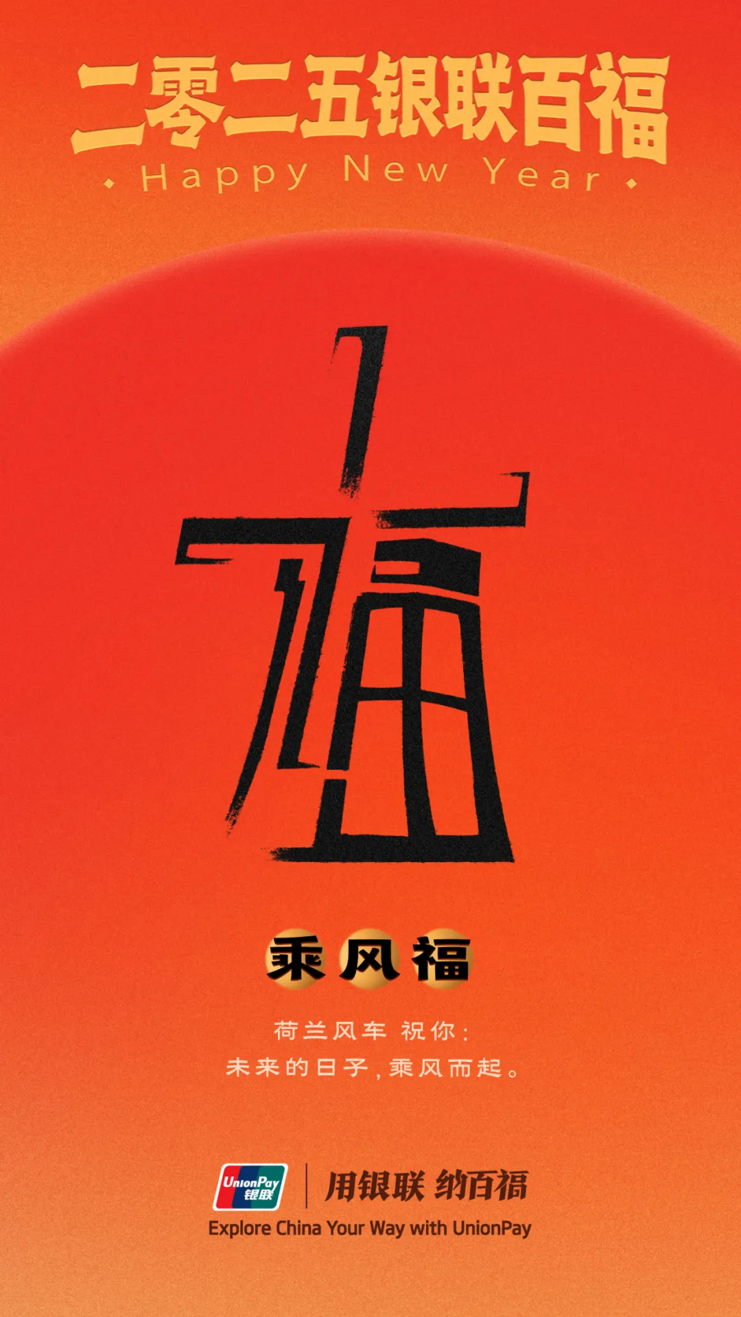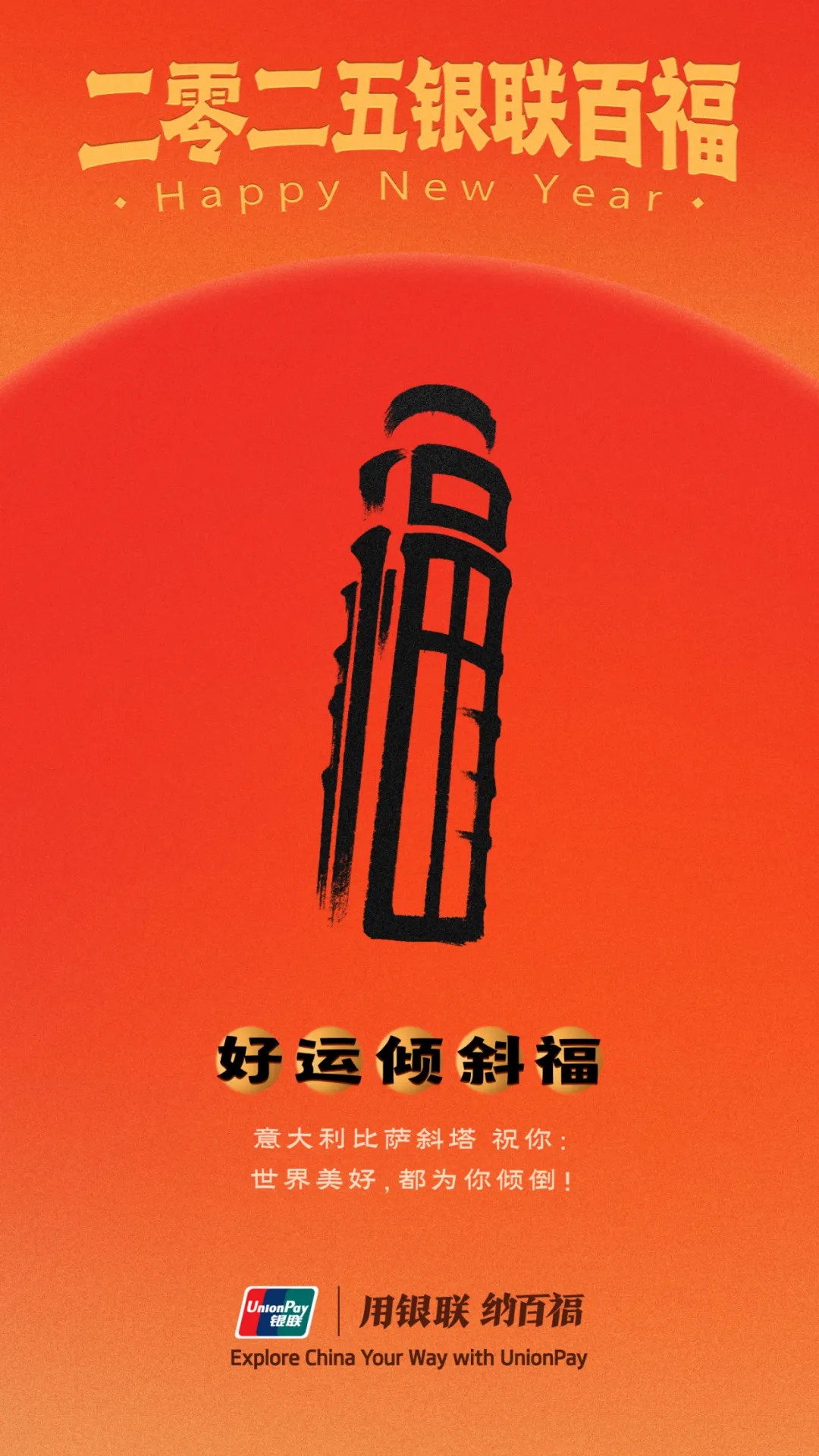 这份新年祝福出自2025银联百福。平安银行携手银联,将世界各地的“美好”象形,写成了福字,给行路匆匆的人们,送上了一句岁末新春、合乎时宜的温暖祝福。
