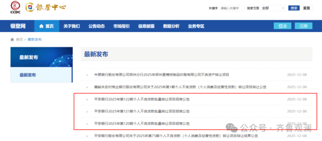 12月8日, 平安银行 发布公告称,该行2025年第120期个人不良贷款批量转让项目的债权金额为7.06亿元,其中,未偿本金总额2.84亿元,未偿利息总额4.17亿元,费用总额556.39万元。该资产包的借款类型为个人经营性贷款,加权平均逾期天数2975天,借款人所在地区为云南省。