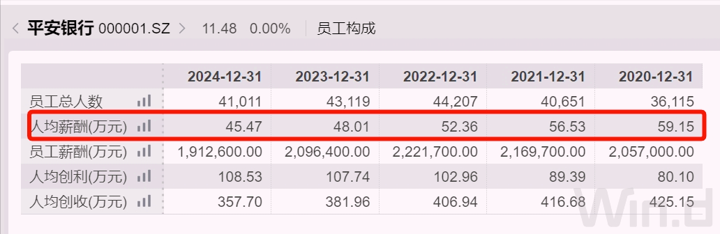 根据 万得 ,2024年 平安银行 职工总数超过4万人,去年人均创利108.5万元,人均税前薪酬45.5万元,比2023年减少约2.5万元,至少连续4年下调,2020年曾超过59万元。