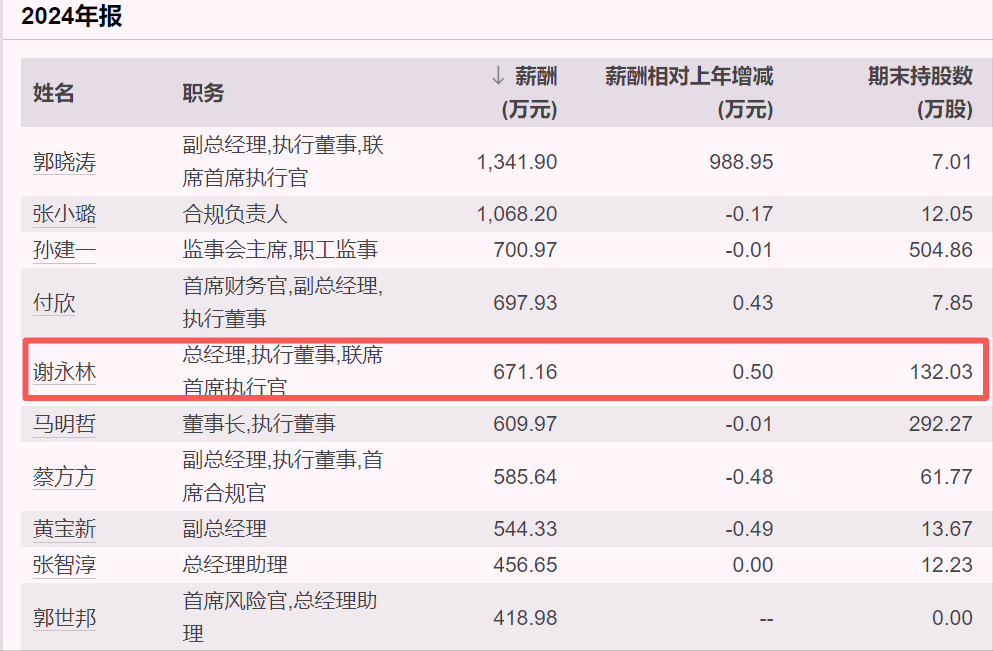 作为董事长,谢永林并不从 平安银行 领取薪酬,而从母公司 中国平安 领取薪酬。年报显示,2024年,他的税前薪酬为671万元,超过平安董事长马明哲,位列第五;并持有132万股票。