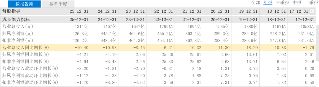 2025年,平安银行营业收入1314.42亿元,同比下降10.4%。如文初杠杆游戏说的,连续第三年幅度不低的下滑。