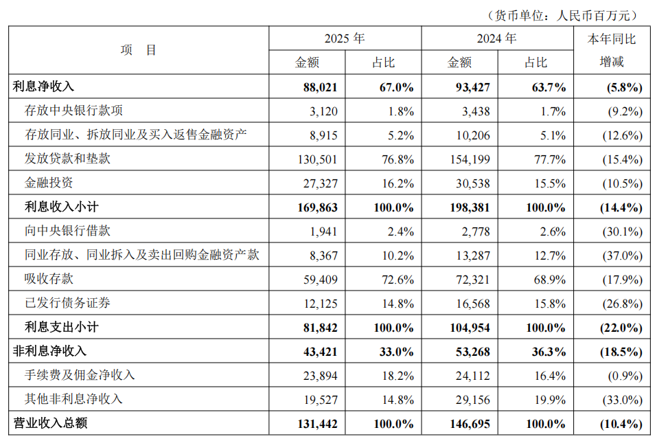 非利息净收入434.21亿元,同比下降18.5%,占比33.03%,较2024年下降3.28个百分点。