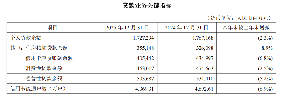 2025年,平安银行个人贷款余额下降2.3%,信用卡应收账款下降6.8%,流通户数少了6.9%。消费性贷款、经营性贷款余额分别下降2.5%、5.2%。