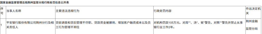 就在2026年3月20日,平安银行刚收到一张105万元的大额罚单,来自国际金融监管局荆州监管分局。主要违法违规事实包括:贷前调查和贷后管理不尽职、贷款资金被挪用、增加客户融资成本、员工行为管理不到位。