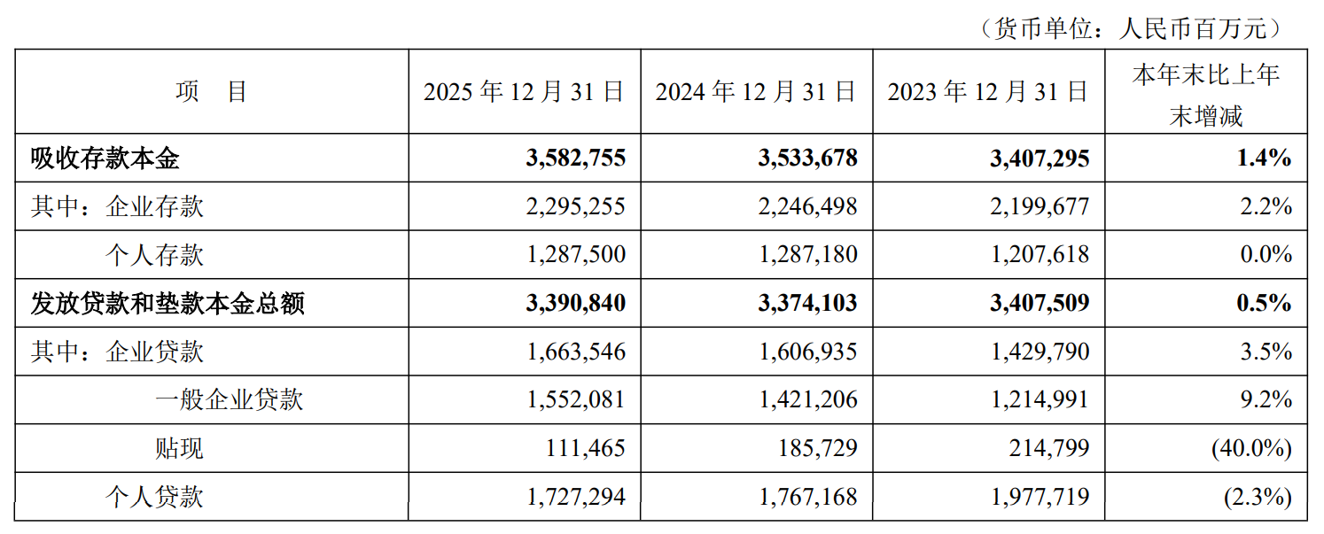 2025年末,平安银行资产总额5.93万亿元,同比增长2.7%;存款总额3.58万亿元,同比增长1.4%;贷款总额3.39万亿元,同比增长0.5%。我们重点来看存贷款变化情况: