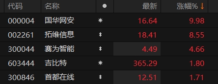 9月20日上午交易时段,A股网络游戏概念股走高。10时45分,国华网安涨停,拓维信息涨超8%,赛为智能、吉比特等跟涨。