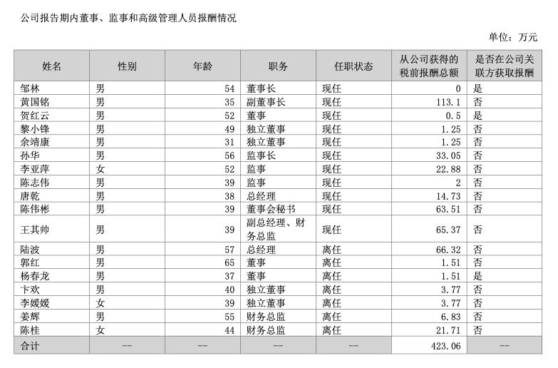 2024年年报显示,公司董事、监事和高级管理人员2024年报酬总额423.06万元。副董事长黄国铭2024年从公司获得的税前报酬总额为113.1万元,总经理唐乾2024年从公司获得的税前报酬总额为14.73万元,董事会秘书陈伟彬2024年从公司获得的税前报酬总额为63.51万元,以上人员均未在公司关联方获取报酬。