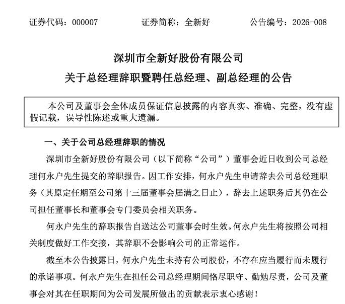 近日,全新好(000007)发布总经理辞职暨聘任总经理、副总经理的公告,因工作安排,何永户先生申请辞去公司总经理职务(其原定任期至公司第十三届董事会届满之日止)。