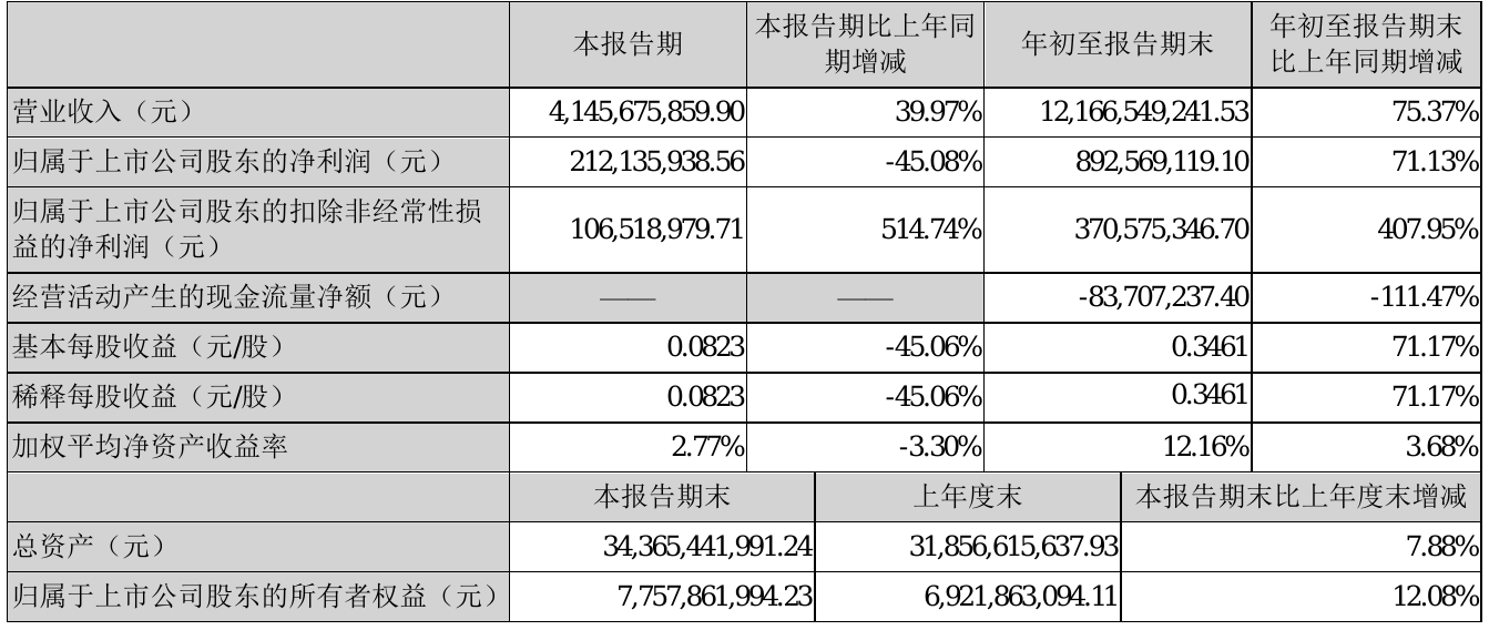 挖贝网10月25日,中国宝安(000009)近日发布2021年前三季度报告,报告期内营业收入12,166,549,241.53元,同比增加75.37%;净利892,569,119.10元,同比净利增加71.13%。