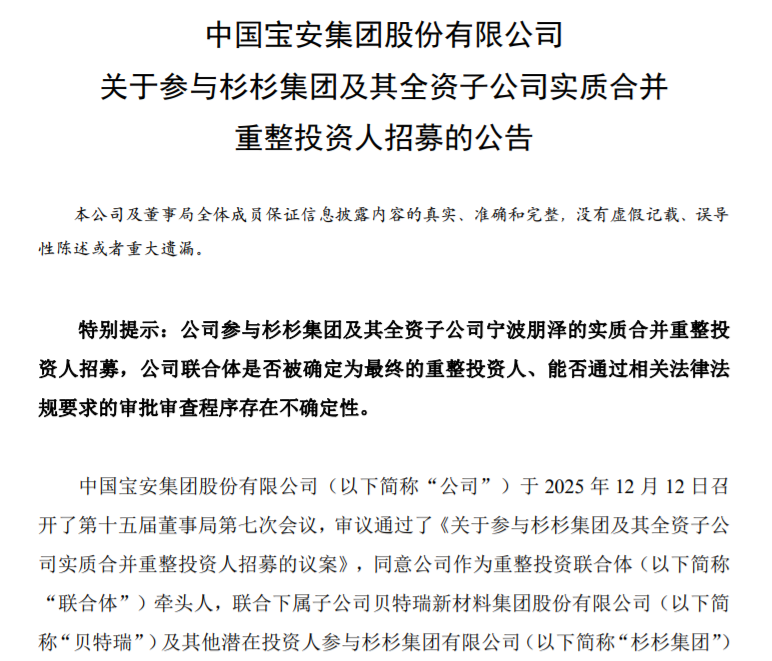 ▲ 中国宝安 发布参与 杉杉 重整招募公告。