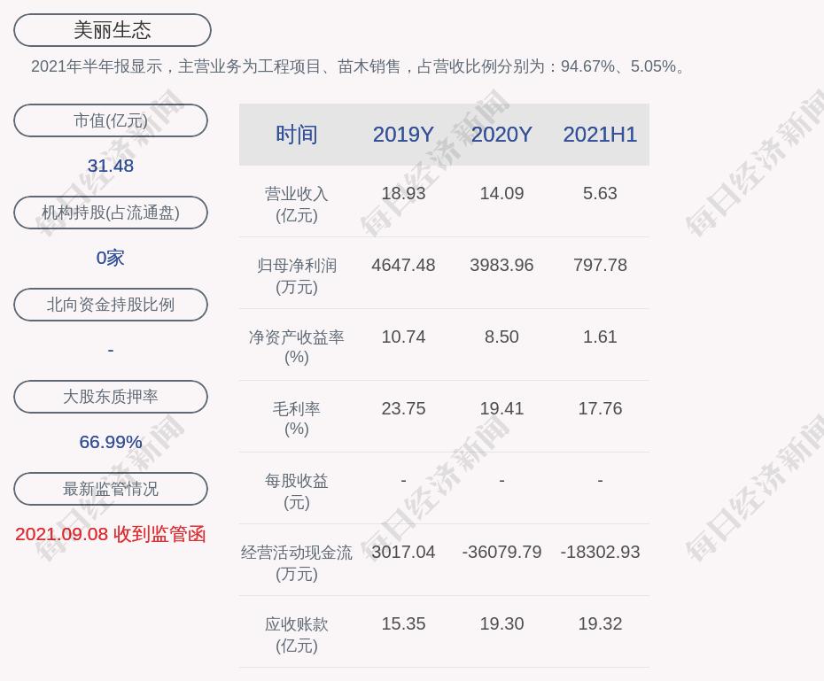 2021年半年报显示,美丽生态的主营业务为工程项目、苗木销售,占营收比例分别为:94.67%、5.05%。