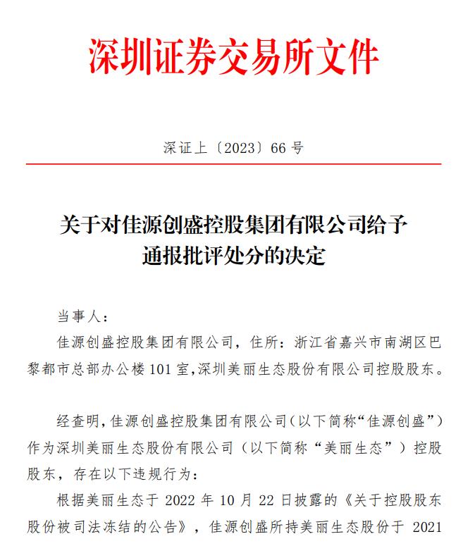 具体来看,根据深交所公布的《关于对佳源创盛控股集团有限公司给予通报批评处分的决定》,美丽生态于2022年10月22日披露的《关于控股股东股份被司法冻结的公告》,佳源创盛所持公司股份于2021年12月27日至2022年10月12日期间多次被冻结、司法标记、再冻结及轮候冻结,累计被冻结、司法标记、再冻结5.83亿股,累计被轮候冻结3.76亿股,累计解除冻结2.16亿股。
