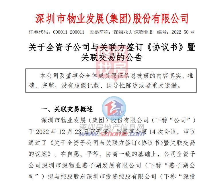 近日,深物业A发布公告,公司全资子公司深圳市深物业燕子湖发展有限公司(下称“燕子湖公司”)拟与控股股东深圳市投资控股有限公司(下称“深投控”)全资子公司中国深圳对外贸易(集团)有限公司(下称“外贸集团”)下属深圳天俊实业股份有限公司(下称“天俊公司”)签订《协议书》。