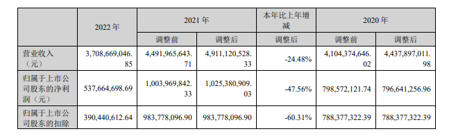 2022年,深物业A营业收入约37亿元,较2021年调整后数据下滑24.48%;归母净利5.4亿元,较2021年调整后数据下滑47.56%。