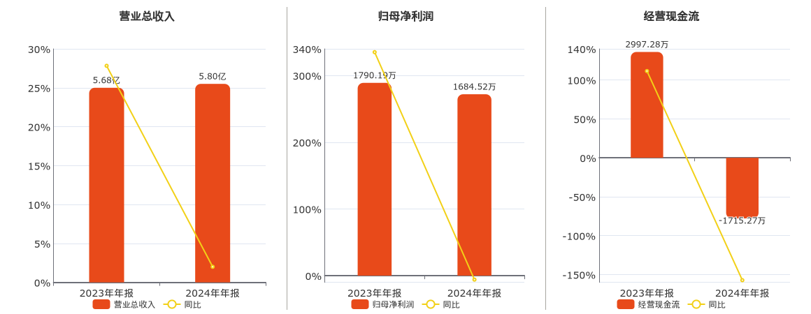公司营业总收入为5.80亿元。归母净利润为1684.52万元,较去年同报告期归母净利润减少105.67万元,同比较去年同期下降5.90%。经营活动现金净流入为-1715.27万元,较去年同报告期经营活动现金净流入减少4712.56万元,同比较去年同期下降157.23%。