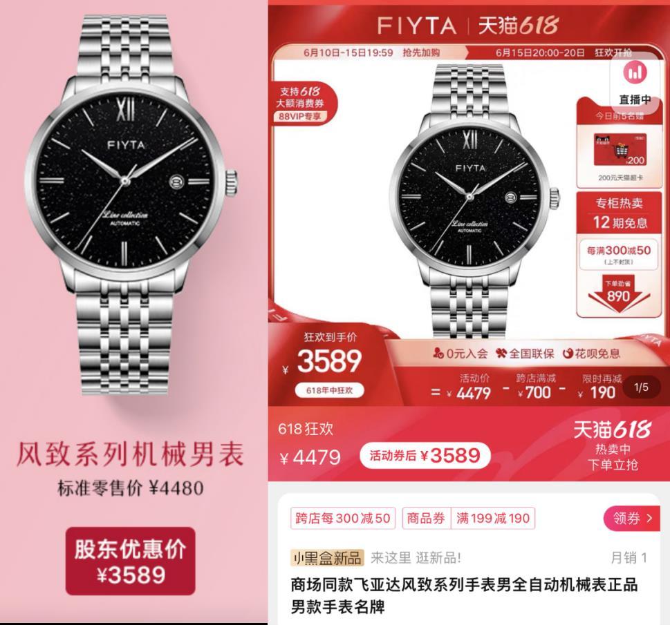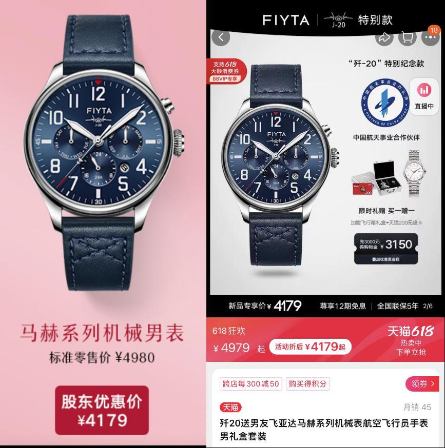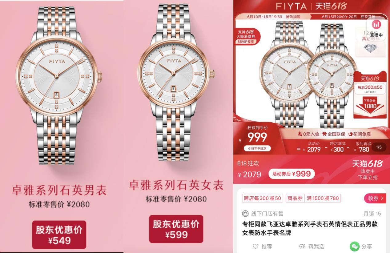 飞亚达股东回馈活动价格与电商价格一致的款式,左侧为股东优惠价,右侧为天猫618大促折后价
