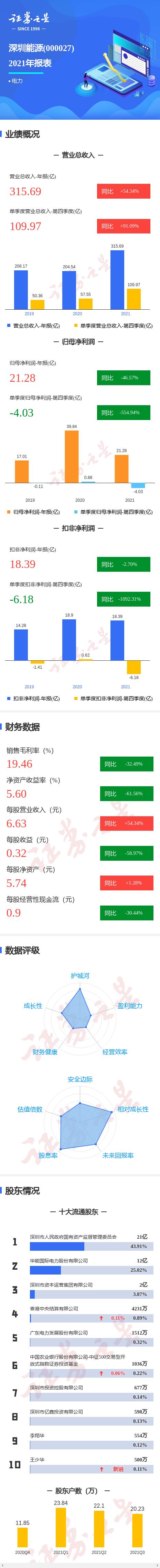 深圳能源2021年报显示,公司主营收入315.7亿元,同比上升54.34%;归母净利润21.29亿元,同比下降46.57%;扣非净利润18.4亿元,同比下降2.7%;其中2021年第四季度,公司单季度主营收入109.98亿元,同比上升91.09%;单季度归母净利润-40386.06万元,同比下降554.94%;单季度扣非净利润-61835.68万元,同比下降1092.31%;负债率62.29%,投资收益8.29亿元,财务费用19.99亿元,毛利率19.46%。