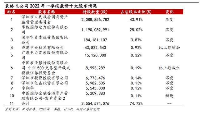 根据2022年一季报披露信息,深圳市国资委直接持有公司 20.89 亿股,占公司总股本的 43.91%,为公司控股股东。公司最终的实际控制人也是深圳市国资委,最终持有公司 48.05%的股权。(报告来源:远瞻智库)