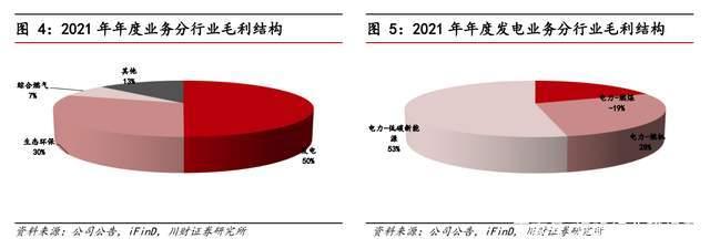 2021年能源电力和能源环保相关业务占据公司销售收入和毛利中绝大部分。在发电业务中,受到煤价大幅上行影响,公司煤电业务毛利为负,低碳新能源业务毛利占比最大。