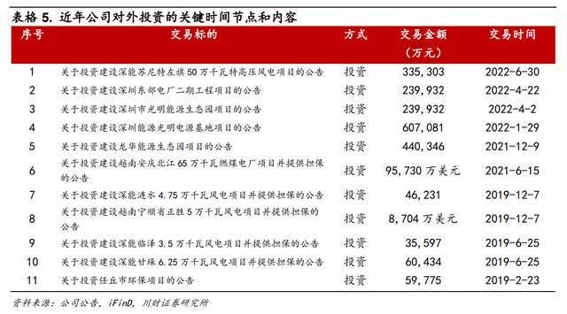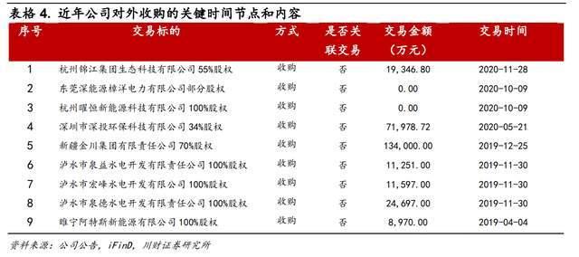 下表是公司近三年的对外收购和投资项目,主要涉及生态环保、水电和低碳新能源业务,其中,水电和低碳新能源相关项目占比最大。