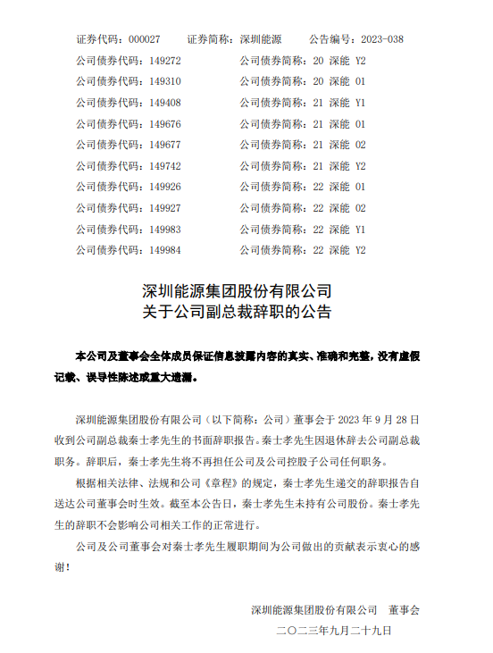 9月29日,深圳能源集团股份有限公司发布公告称,公司董事会收到公司副总裁秦士孝先生的书面辞职报告。