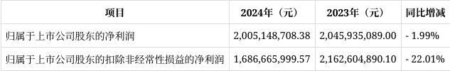 归属于上市公司股东的净利润为2,005,148,708.38元,同比减少1.99%。扣除非经常性损益的净利润为1,686,665,999.57元,同比下降22.01%。净利润下滑主要源于电力板块成本上升,尽管公司在其他业务板块有所拓展,但仍未能抵消电力板块成本压力对利润的影响。