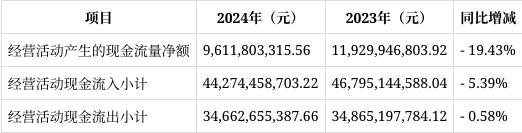 经营活动产生的现金流量净额为9,611,803,315.56元,同比减少19.43%。经营活动现金流入小计44,274,458,703.22元,同比下降5.39%;现金流出小计34,662,655,387.66元,同比减少0.58%。流入减少幅度大于流出减少幅度,反映出公司在经营活动中的现金回笼能力有所减弱,运营效率有待提升。
