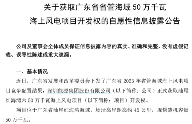深圳能源早在2023年10月便通过广东省省管海域海上风电项目竞争配置,获得汕尾红海湾六50万千瓦项目开发权,此次公告标志着该项目从规划进入实质建设阶段。