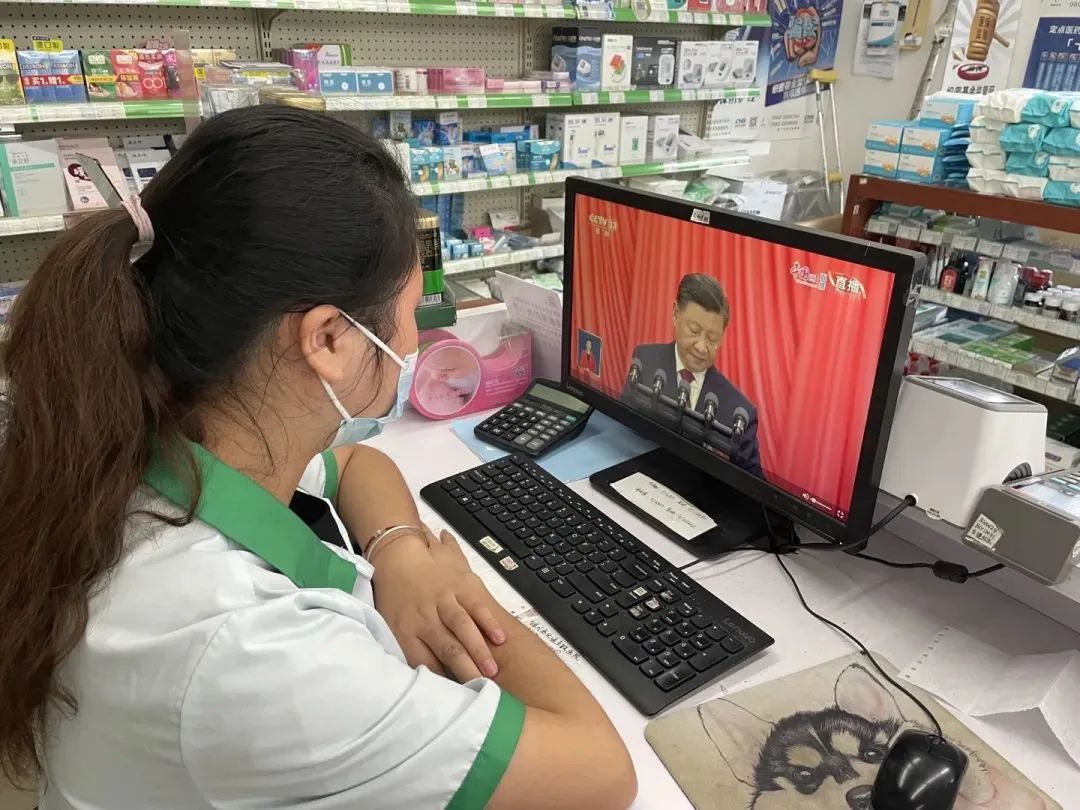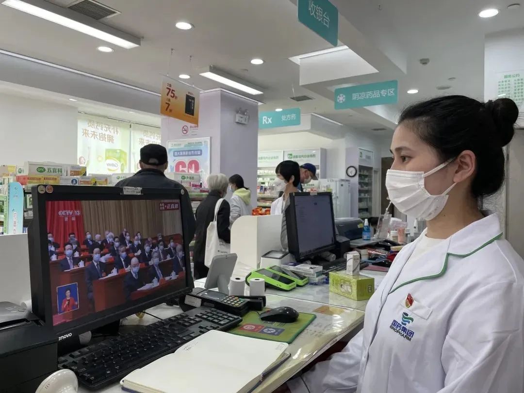 国大药房南京西路店店长、上海市五一劳动奖章获得者刘佳美在药房岗位收看开幕会