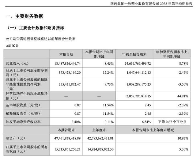 10月24日,国药集团一致药业股份有限公司(以下简称“国药一致”或“公司”)发布2002年第三季度业绩报告。公告称,2022年前三季度营收约546.17亿元;归属于上市公司股东的净利润约10.48亿元;基本每股收益2.45元。2022年第三季度,公司实现归属上市公司股东净利润3.73亿元,同比增长12.24%。
