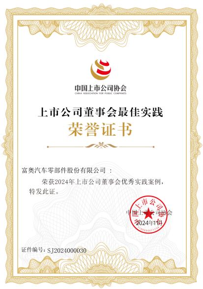 近日,中国上市公司协会揭晓了“2024年上市公司董事会最佳实践案例”的评选结果,富奥股份公司凭借在董事会规范运作、提高信披质量、强化投资者关系管理以及践行ESG理念等方面的优秀表现,从5000余家上市公司中脱颖而出,再度荣获上市公司董事会“优秀实践案例”。上市公司董事会最佳实践案例评选已连续开展两年,富奥股份公司连续两年获得此项荣誉,充分体现了中国上市公司协会对公司董事会规范运作与创新实践的高度认可。