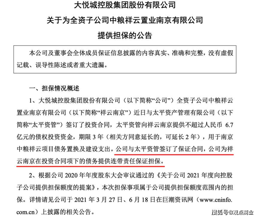 日前,中国最大的粮油食品企业中粮集团旗下地产公司大悦城控股集团(简称“大悦城”,股票代码:SZ000031)发布一则公告,为旗下控股子公司中粮祥云置业南京有限公司提供不超过人民币6.7亿元的债权投资资金,期限3年(相关方同意延长的,可延长2年),用于南京中粮祥云项目债务置换及建设支出。