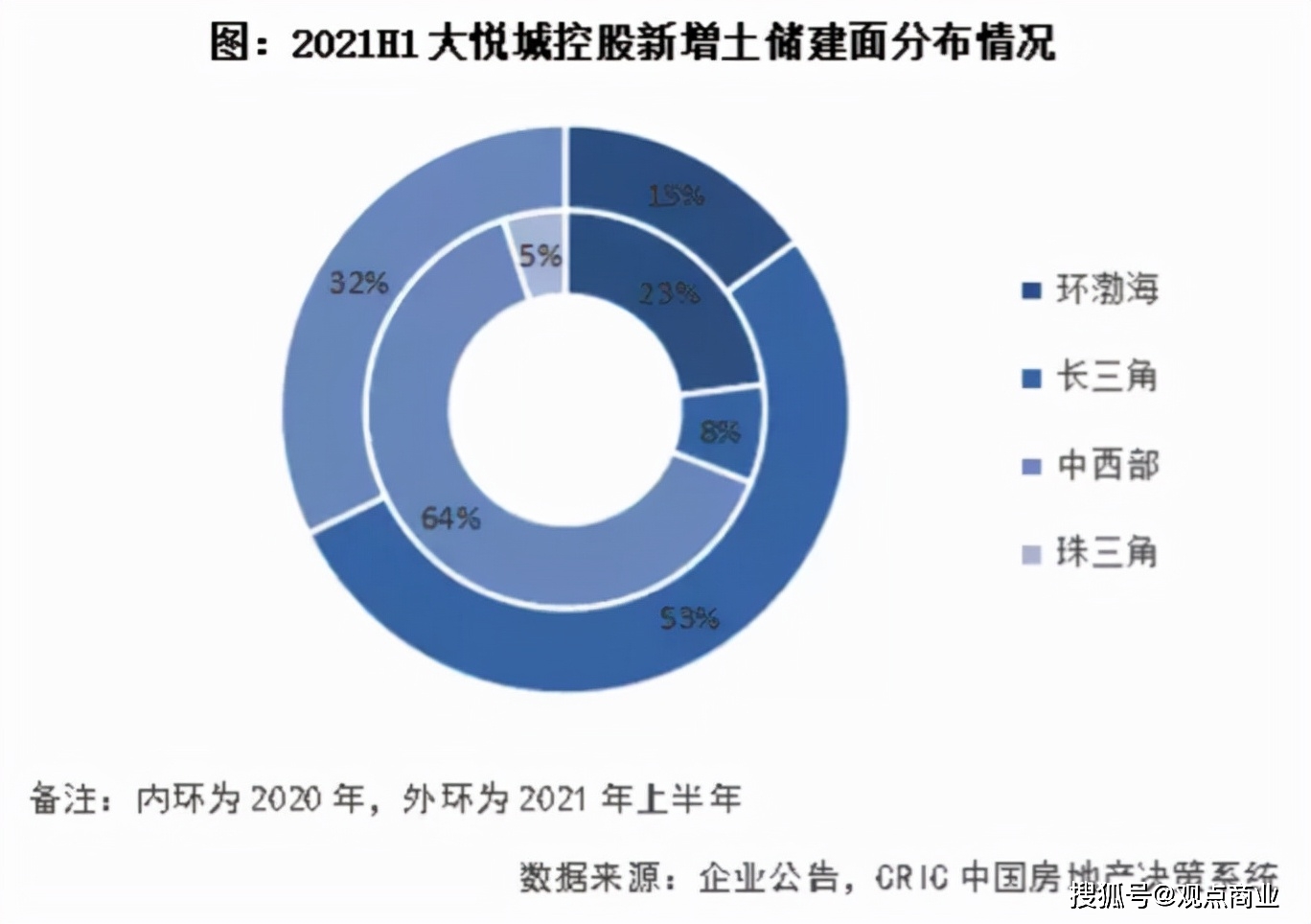 根据其财报及公开数据整理,截止到2021年上半年,大悦城新增土储中53%来自于长三角城市群,其次32%的新增土储来自中西部,主要位于成渝经济圈,剩余15%的土储位于京津冀环渤海区域。