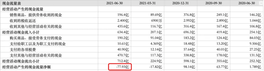 而且从其现金流表现来看,整个上半年其经营性现金流同比减少4456%,从净流入1.789亿元,直接下滑至净流出77.93亿元,而在2020年全年,其经营性现金流净额高达98.14亿元。