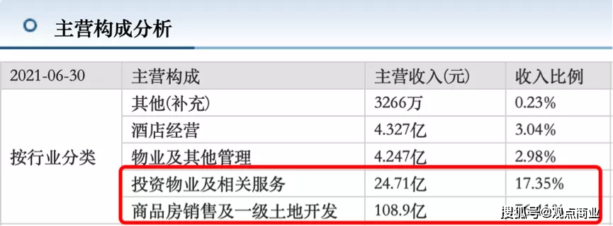 截止到上半年,大悦城实现商品房销售及一级土地开发108.9亿元,同比增长13%,占总营收比重约76.4%。投资物业及相关服务营收为24.71亿元,占比仅为17.35%,同比微增0.71个百分点。