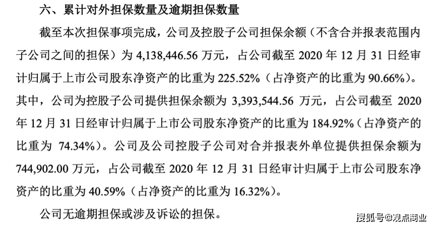 本次担保完成后,大悦城当前担保余额增至413.84亿元,占公司截至2020年12月31日经审计归属于上市公司股东净资产的比重为225.52%(占净资产的比重为90.66%)。