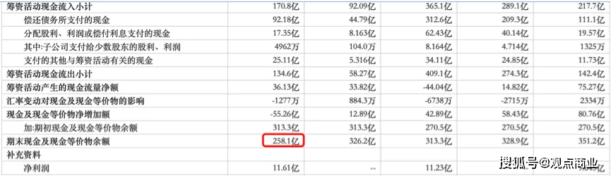 由此导致其期末现金及现金等价物余额为258.1亿元,较2020年年中减少了93.1亿元。