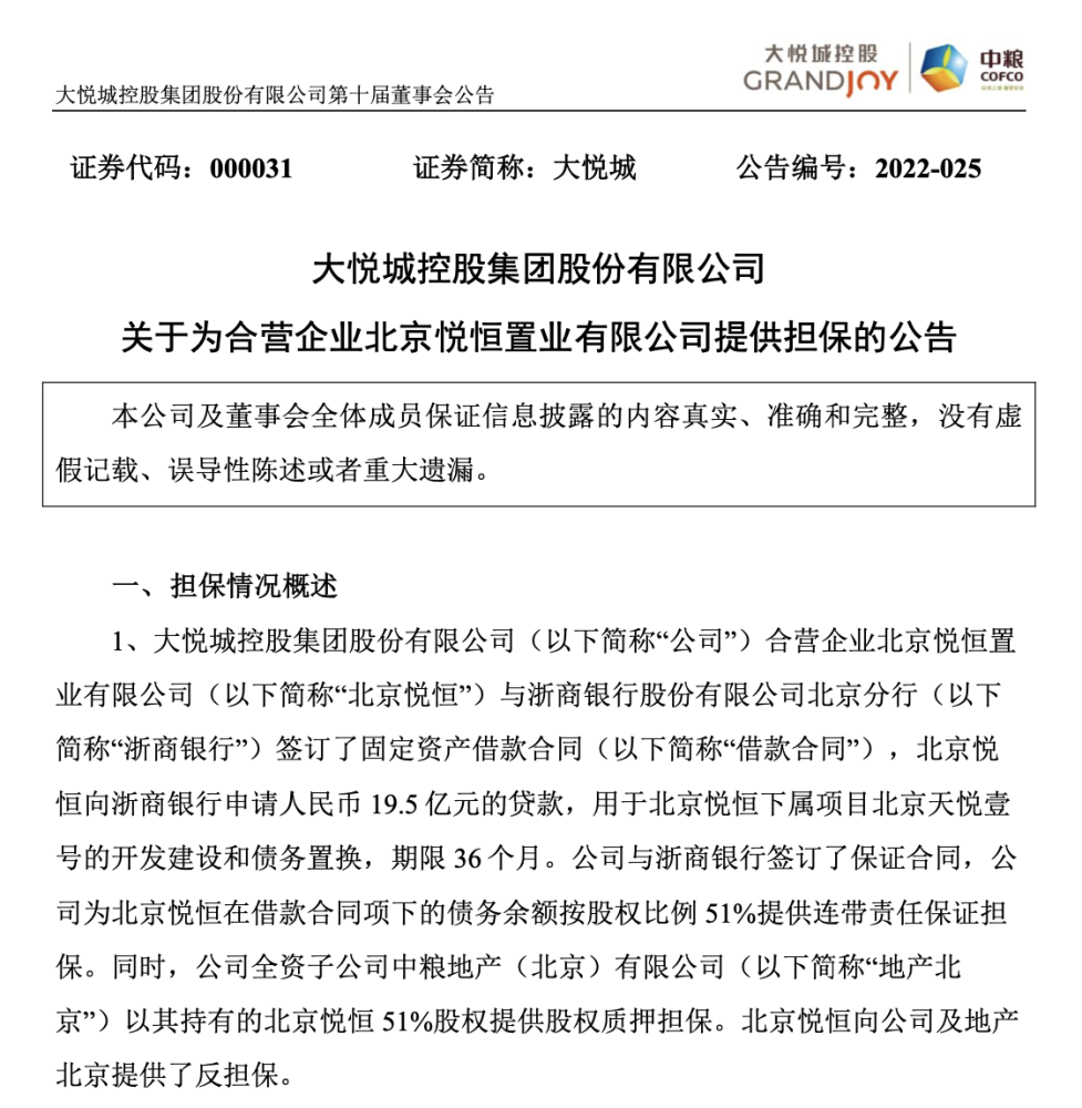 4月18日,大悦城(SZ:000031)发布公告称,北京悦恒置业有限公司向浙商银行股份有限公司北京分行申请人民币19.5亿元的贷款,用于北京悦恒下属项目北京天悦壹号的开发建设和债务置换,期限36个月。大悦城已与浙商银行签订保证合同,为北京悦恒在借款合同项下债务余额的51%部分提供连带责任保证担保,担保本金不超过9.945亿元。