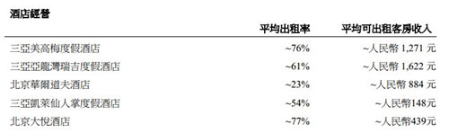 酒店经营方面,目前大悦城地产旗下有三亚美高梅度假酒店、三亚亚龙湾瑞吉度假酒店、北京华尔道夫酒店、三亚凯莱仙人掌度假酒店、北京大悦酒店等五家酒店运营,平均出租率在23%-77%不等。
