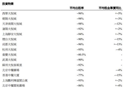投资物业方面,目前大悦城地产旗下共有15处投资物业,包含了商业物业、写字楼以及公寓等业态。除重庆大悦城、香港中粮大厦和北京中粮置地广场外,大多数投资物业出租率在90%以上,其中朝阳大悦城和天津南开大悦城以98%的出租率领居于首位。从租金来看,香港中粮大厦和烟台大悦城以平均租金单价波动较大,同比出现了15%的降幅;而成都大悦城则实现了平均租金单价同比13%的涨幅。