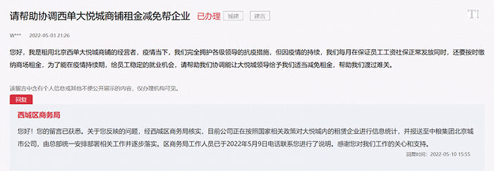 界面新闻了解到,今年5月初,便有西单大悦城商户在领导留言板上建言,希望西单大悦城能为商铺减免租金,西城商务局回应称,正在按照国家相关政策对租赁企业进行信息统计,并报送至中粮集团统一部署落实。