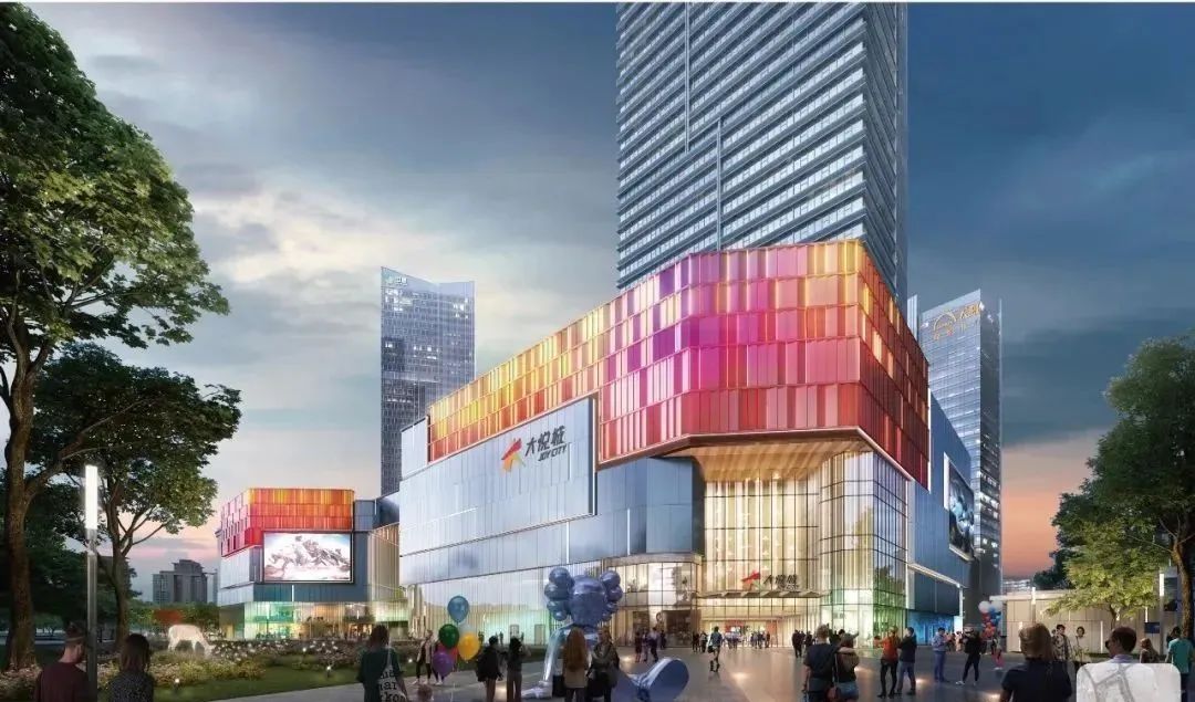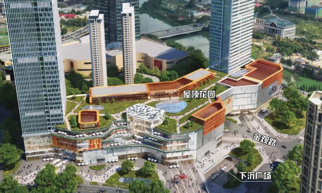 从商业综合体建筑布局看,整体是由1栋6层商业建筑组成,内部设计有3个中庭,屋顶规划有花园,靠近中央公园处设计为退台式,金观路南侧设计有一个下沉广场,商业中部还有一条市政道路,预留了与地铁4号线观洲站地铁联络通道,商业整体的外立面色彩以橙色+灰白色+玻璃幕墙为主,整体较为时尚。
