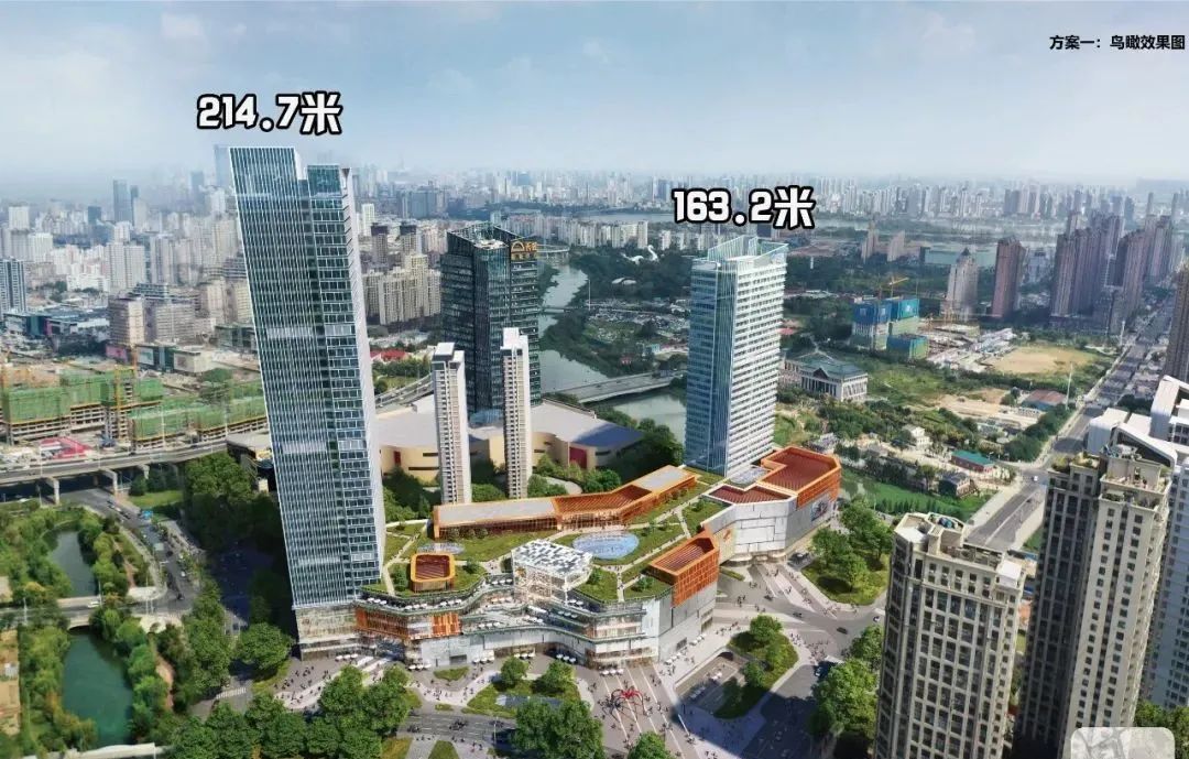 从建筑布局看,项目由1栋214.7米超高层办公楼、1栋163.2米公寓楼以及6层高的商业综合体组成,其中超高层位于地块西侧,公寓楼位于地块东侧,商业综合体处于地块中部。