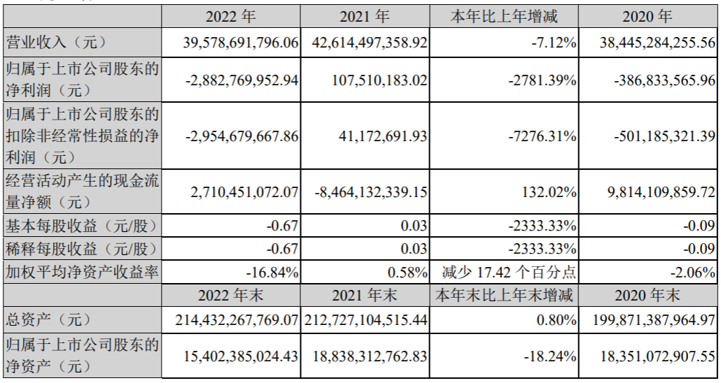 报告期公司实现净利润-22.23亿元,归母净利润-28.83亿元。报告期经营活动净现金流27.10亿元,同比增长132.02%。报告期末公司总资产2,144.32亿元,较年初增长0.80%;归属于上市公司股东的净资产154.02亿元,较年初下降18.24%。