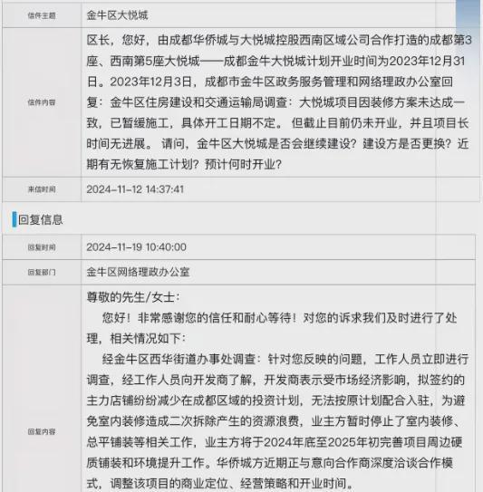 近期,有市民在金牛区政府网站上咨询“金牛大悦城原计划2023年底开业但至今未开业,且项目长时间无进展”的相关问题。
