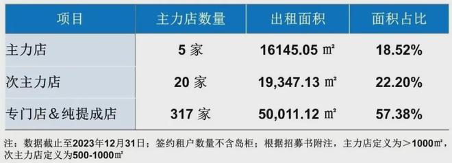截至去年底,成都武侯大悦城主力店5家,出租面积1.61万方,占该项目可供出租总面积比18.52%;次主力店20家,出租面积1.93万方,占比22.2%;专门店及纯提成店317家,出租面积超5万方,占比57.38%。